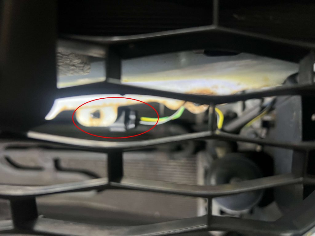De temperatuursensor wordt geplaatst tussen de voorbumper en de radiateur, op een plek waar de rijwind langs de sensor komt. De twee draden voor die sensor moeten vanaf de klok via het schutbord naar de voorkant van de auto geleid worden. Die draden kun je bijvoorbeeld langs de kabel voor de motorkapontgrendeling laten lopen. Hieronder zie je een foto van de locatie van de temperatuursensor bij de MX-5 NC.