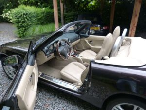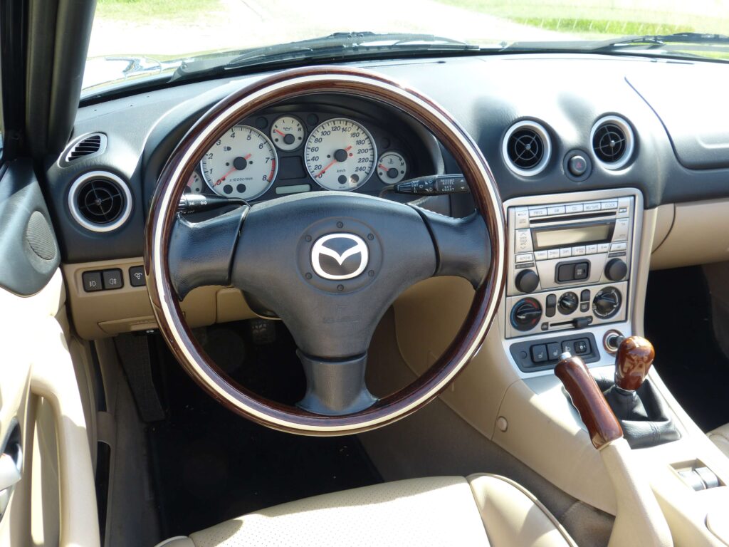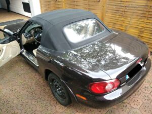 Omdat mijn eerste MX-5 zo’n beetje wel af was, met uitzondering van het overspuiten vanwege reparaties aan de dorpels en wat lak-schades, was ik op zoek naar een projectauto voor de herfst en winter. De auto was duidelijk goed verzorgd en origineel, dus zonder modificaties, maar niet helemaal compleet. De beige tonneau cover werd na een speurtocht in de kelder teruggevonden. Het beige windschot met speakers ontbreekt nog.