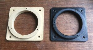Het adapterplaatje is nodig, omdat de nieuwe speaker op drie plaatsen wordt vastgezet, terwijl de standaar speaker met 4 schroeven in het windschot gemonteerd wordt. In eerste instantie had ik de adapterplaatjes van MDF gemaakt, maar recent ben ik overgestapt op PETG, een materiaal dat gebruikt wordt om in 3D te printen. Het ontwerp heb ik in TinkerCAD gemaakt, en lokaal laten printen. Het resultaat maakt de montage een stuk eenvoudiger, en het laten printen kost me veel minder tijd dan zelf met MDF aan de slag te gaan.