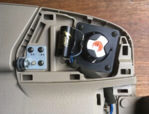 De kwaliteit van de standaard 2-inch speakers, die in het windschot gemonteerd zijn, is echter niet best. Uiteraard is het beter dan niets, maar er is duidelijk ruimte voor verbetering. Eerst maar eens kijken wat er als standaard speaker in zit. De plastic kapjes achterop het windschot zijn redelijk eenvoudig te verwijderen. Ter info: Mijn eerste MX-5 had origineel een zwart windschot, maar sinds de komst van project Lübeck is dat vervangen door een beige windschot. Ik heb de aanpassing dus meerdere keren gedaan.